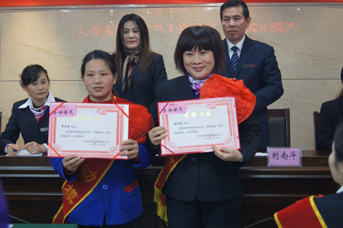 身披授帶佩戴紅花的獲獎(jiǎng)人員